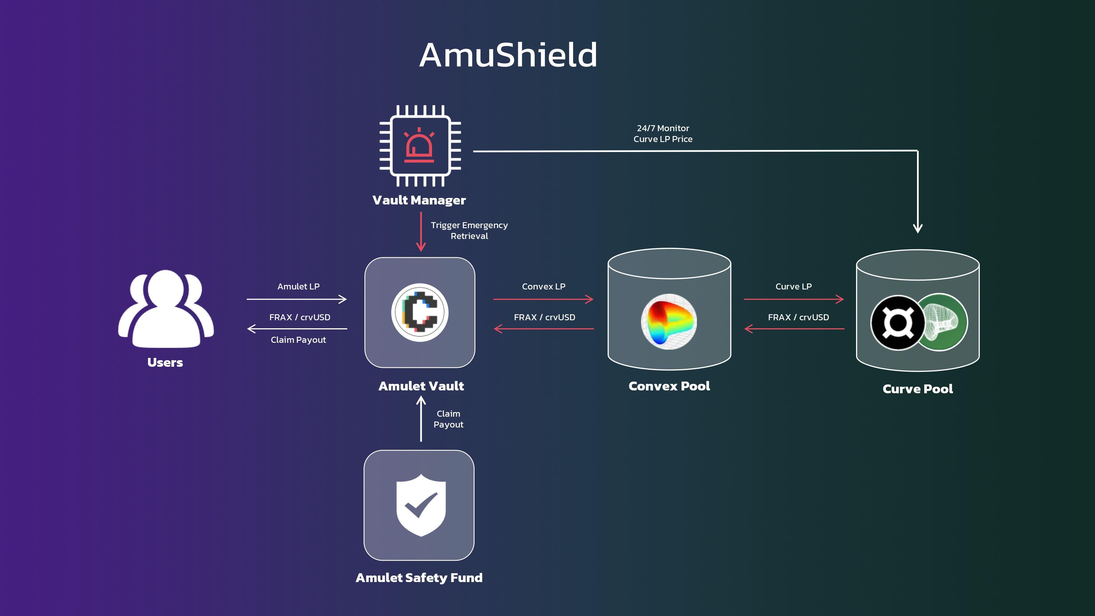 <table><thead><tr><th width="136">Component</th><th>Description</th></tr></thead><tbody><tr><td>Vault manager</td><td>Receives data 24/7 on the underlying pool's Current Price and triggers Amulet vault for vault suspension and emergency retrieval of residual funds in case of loss of funds to an attack on the pool.</td></tr><tr><td>Amulet Vault</td><td>Suspends vault operations to prevent further increase in exposure, then systemically attempts to retrieve any residual funds from the underlying pool. Meantime, the underlying pool may return funds recovered or pay compensation to the vault.</td></tr><tr><td>Amulet Safety Fund</td><td>Provides some basic financial coverage to compensate users from available capacity for losses sustained.</td></tr></tbody></table>